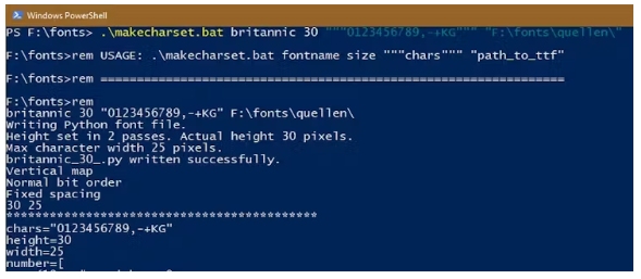 現(xiàn)在目錄britannic_30.py中有一個(gè)文件,其中包含新字符集的像素?cái)?shù)據(jù)。僅實(shí)現(xiàn)字符“0123456789,-+KG”“”,節(jié)省存儲(chǔ)空間。您可以從目錄源中的Windows字體列表中獲取其他簽名速率,如上面指定的復(fù)制和轉(zhuǎn)換。請(qǐng)注意,文件名指定時(shí)沒有附加。tttf。