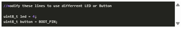 我們將使用GPIO 4,確保led引腳定義為4,如下所示,并且打開或關(guān)閉它的按鈕是BOOT_PIN(內(nèi)置引導(dǎo)引腳),您可以使用外部按鈕,但您必須在這里定義它