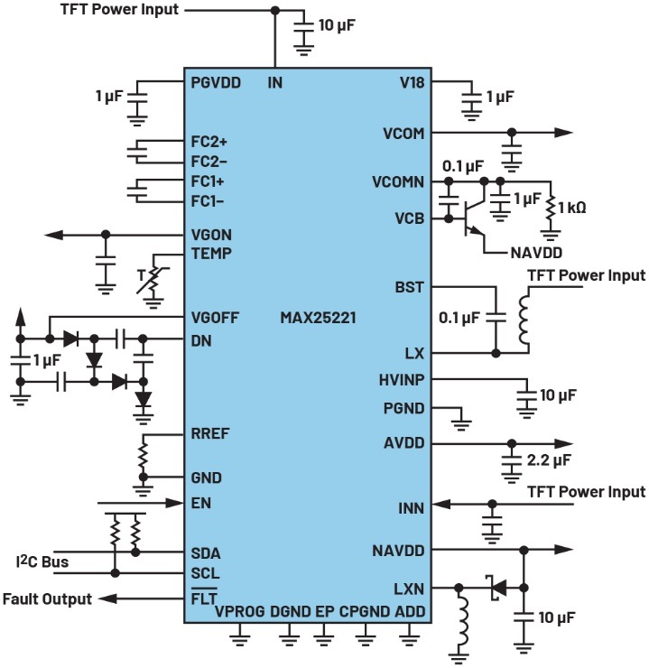 如圖8所示,集成TFT電源電路(MAX25221)利用升壓轉(zhuǎn)換器提供的AVDD和NAVDD,為源驅(qū)動器(也稱為列驅(qū)動器)供電。柵極驅(qū)動器(也稱為行驅(qū)動器)由兩個獨(dú)立電荷泵產(chǎn)生的VGH和VGL供電。此外,該電路還集成了VCOM和VCOM溫度補(bǔ)償。