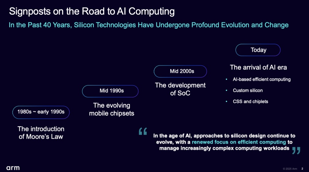 報告指出,通過摩爾定律實現(xiàn)半導體縮放的傳統(tǒng)方法已達到物理與經(jīng)濟的極限,產(chǎn)業(yè)正轉(zhuǎn)向創(chuàng)新的替代方案,如定制芯片、計算子系統(tǒng) (CSS) 以及芯粒 (chiplet),以持續(xù)提升性能與能效。如何應(yīng)對AI時代的芯片設(shè)計難題?芯片設(shè)計的未來是什么?且看Arm的洞察與解析。