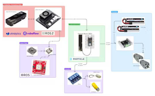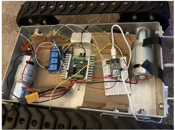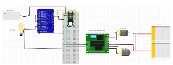 兩個(gè)11.1V的LiPo電池為驅(qū)動(dòng)履帶車輪的電機(jī)控制器供電。該系統(tǒng)還提供5V電源,為4通道繼電器、水泵和伺服供電,因?yàn)榕鹬惶峁?.3V電源。硼通過(guò)TX引腳發(fā)送TTL信號(hào)到電機(jī)控制器來(lái)調(diào)節(jié)車輪的速度和方向。它還通過(guò)數(shù)字引腳(高或低)發(fā)送數(shù)字信號(hào)來(lái)控制操作水泵和伺服的繼電器通道。