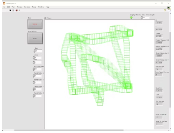 當(dāng)所有的“松露”都被收集完畢后,機(jī)器人會(huì)返回到之前繪制的標(biāo)簽位置,并將每一塊松露放在相應(yīng)的彩色編碼區(qū)域。由于該計(jì)劃的性質(zhì),下車地點(diǎn)可能不像期望的那樣準(zhǔn)確。為了解決這個(gè)問(wèn)題,用戶還可以在球自動(dòng)掉落之前操作機(jī)器人15秒,以減輕任何糟糕的地圖位置。這種遠(yuǎn)程操作是通過(guò)LabVIEW通過(guò)WiFi(到樹莓派)與機(jī)器人進(jìn)行串行通信來(lái)執(zhí)行的。(有關(guān)LabVIEW接口的更多細(xì)節(jié),請(qǐng)參閱附加功能)。