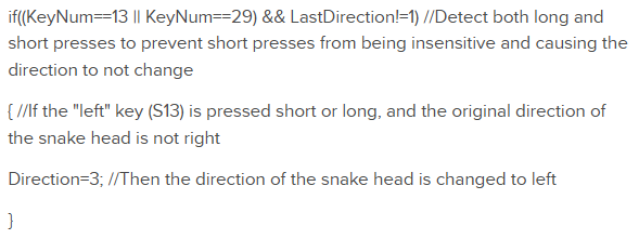 使用計時器每20ms調(diào)用中斷函數(shù)中的檢測函數(shù)(跳過debounce),檢測按下了哪個鍵,判斷是短按、長按還是釋放,并將相應(yīng)的鍵碼值保存到一個變量中,然后在主函數(shù)中獲取鍵碼值來控制游戲運行。在游戲中,短按方向鍵和長按方向鍵會改變蛇頭的方向,使控制更加準確。