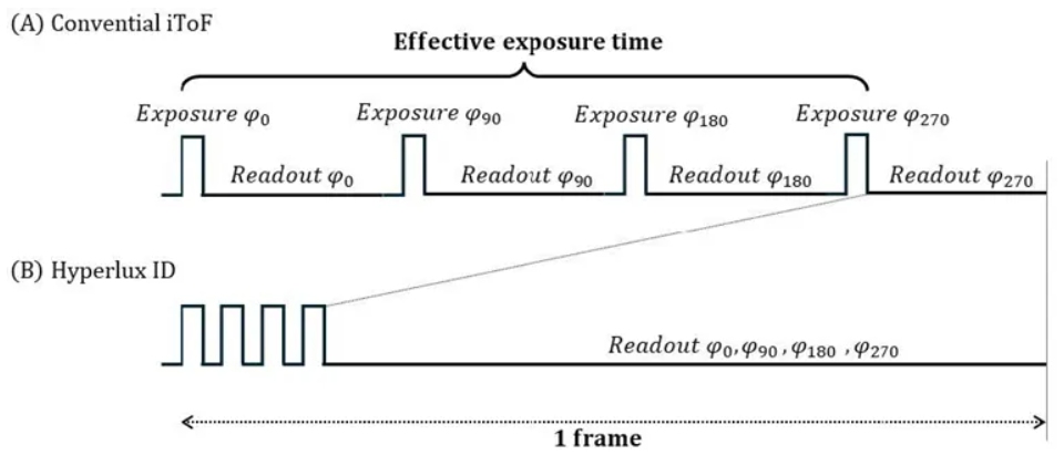 常規(guī) iToF 傳感器在每次相位曝光后,都會將數(shù)據(jù)讀出到外部處理器。從第一次 φ0 曝光到 φ270 曝光完成,需要一定的時間。如果目標物體在此期間移動,則感知結(jié)果中會出現(xiàn)運動偽影。Hyperlux ID 內(nèi)置存儲器,可以保留必要的相位數(shù)據(jù)。這里的技術(shù)突破在于,所有四相信息都直接存儲在像素中。曝光結(jié)果原封不動地存儲在像素存儲器內(nèi)。因此,下一相位曝光可以在很短的時間內(nèi)開始,從而減少了四個相位的總曝光時間,運動偽影得以大幅減少。
