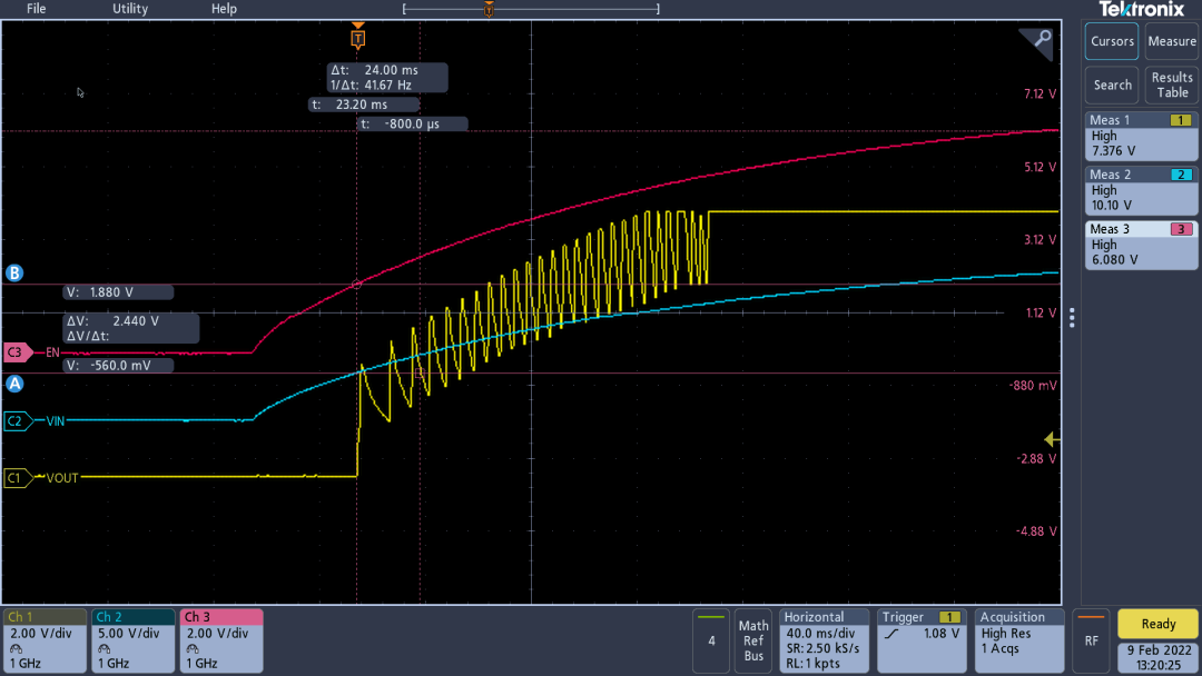 某款電源芯片上電瞬間出現(xiàn)輸出電壓來回震蕩的現(xiàn)象,如下圖4所示。