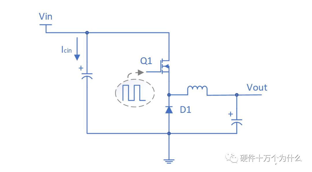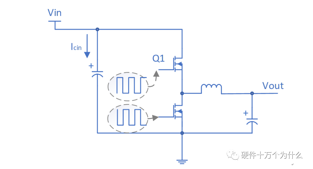 我們先看功率路徑(能量傳遞路徑)的波形。首先輸入的是一個(gè)直流電壓Vin,電壓稍微高一些,例如直流12V、24V、48V等等。最終輸出的電壓也是一個(gè)直流電壓Vout,是我們最終生成的供電電壓,例如直流5V、3.3V等。