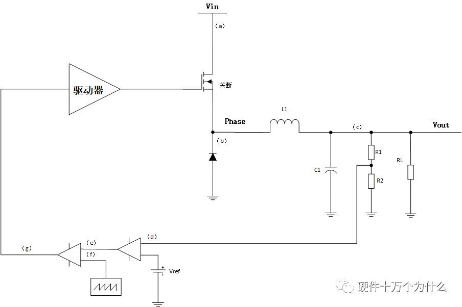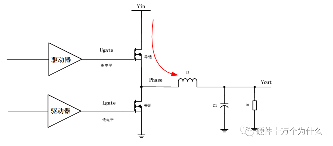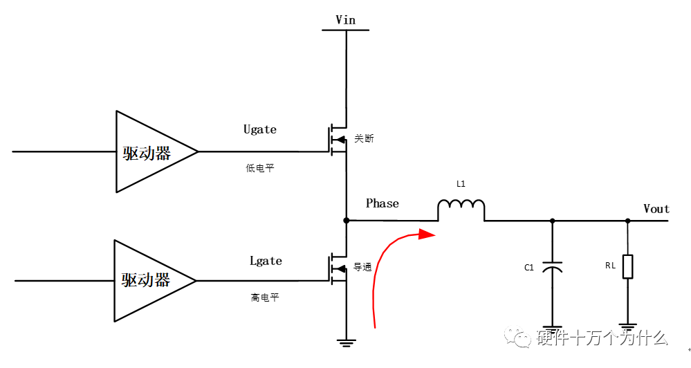 Q1關(guān)斷時(shí),二極管參與電流回路,與電感串聯(lián),通過(guò)功率電流,為輸出供電。電感L1會(huì)保持原來(lái)的電流方向,并且試圖保持原來(lái)大小,成為了一個(gè)能量提供的器件,瞬間形成了一個(gè)反向電動(dòng)勢(shì)。電感右邊的電壓仍然是輸出電壓,電感的左邊會(huì)從Vin瞬間變成一個(gè)負(fù)壓。二極管從截止?fàn)顟B(tài),變成正向?qū)顟B(tài),二極管的正端為0V(GND),它因?yàn)橛姓驅(qū)▔航?,其?fù)端的電壓是一個(gè)負(fù)壓。此時(shí)Phase點(diǎn)的電壓也就變成了一個(gè)負(fù)壓。