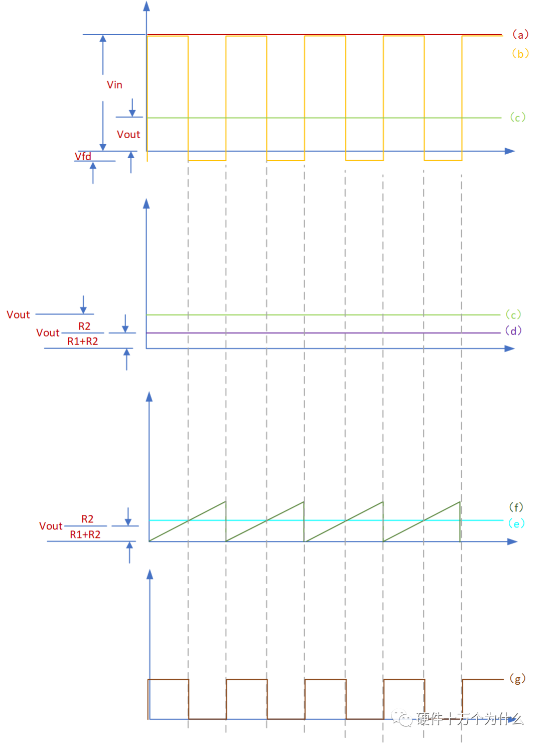 采樣電阻R1和R2檢測(cè)輸出電壓Vout,如圖5.10(c),兩個(gè)電阻分壓后輸出一個(gè)電壓如圖5.10(d)所示,并將其輸入誤差放大器(EA)與參考電壓Vref進(jìn)行比較,如圖5.10(e)。被放大誤差電壓Vea被輸入到脈沖調(diào)制器(電壓比較器)中。這個(gè)比較器的另一個(gè)輸入是周期為T(mén)的鋸齒波如圖5.10(f)所示,圖中的案例為幅值3V。PWM電壓比較器產(chǎn)生的矩形脈沖波。聽(tīng)從鋸齒波的起點(diǎn)開(kāi)始到鋸齒波與誤差放大器輸出電壓交點(diǎn)結(jié)束。因此PWM輸出的脈沖寬度Ton與誤差放大器EA輸出的電壓成正比,如圖5.10(g)所示。