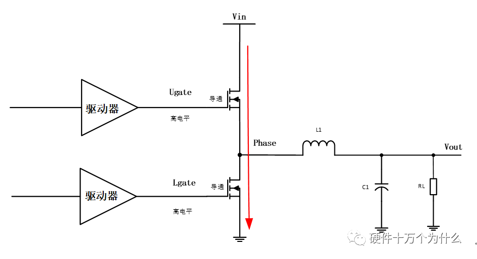 圖5.6非同步Buck上管關(guān)閉二極管續(xù)流(下MOS更換為二極管)在同步Buck電路中,最理想的狀態(tài)是上管關(guān)閉的一瞬間,下管打開(kāi);下管關(guān)閉的一瞬間,上管打開(kāi)。如果能?chē)?yán)絲合縫,沒(méi)有一點(diǎn)點(diǎn)時(shí)間差,則上面兩個(gè)狀態(tài)就足以把同步Buck電路工作起來(lái)了。但是MOSFET不是理想的開(kāi)關(guān)特性,它在關(guān)斷到導(dǎo)通的過(guò)程中存在一個(gè)過(guò)渡的過(guò)程就是一個(gè)放大區(qū),介于完全關(guān)斷和完全導(dǎo)通之間的一個(gè)狀態(tài)。另外控制時(shí)序也是不理想的,不可能做到“嚴(yán)絲合縫”。也就是說(shuō),兩個(gè)驅(qū)動(dòng)器在時(shí)間上是非常難控制到精確的同步。我們有一個(gè)狀態(tài)是必須要避免的,就是上管和下管同時(shí)打開(kāi)。此時(shí),Vin通過(guò)兩個(gè)打開(kāi)的MOSFET直連到GND,形成了短路。這種直通的現(xiàn)象,即會(huì)損壞MOSFET,也會(huì)導(dǎo)致Vin短路而損壞前一級(jí)供電電源,如圖5.7所示。