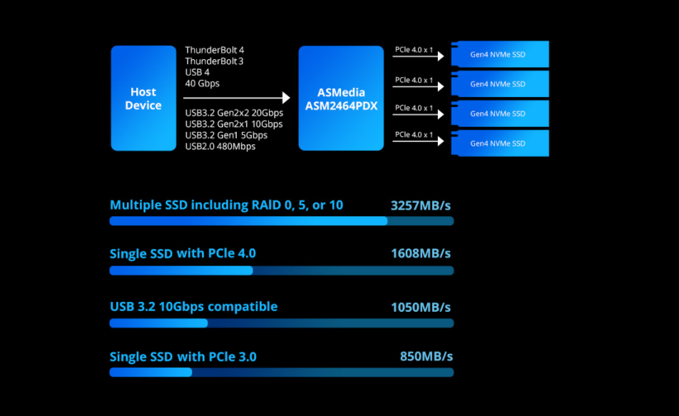 鐵威馬D4 SSD專為媒體創(chuàng)作、影視制作應(yīng)用場景設(shè)計,全面兼容USB4 傳輸協(xié)議,提供40Gbps高速寬帶。同時可作為Mac mini外置存儲擴展方案,可作為Mac OS系統(tǒng)啟動盤,針對游戲玩家,可將電腦大型游戲程序安裝至該設(shè)備,使用體驗與安裝至電腦本地盤無異,真正實現(xiàn)零延遲運行。并且具備高達 40Gbps 的帶寬。在四盤位全 SSD 配置下,實測讀寫/速度可達 3257MB/s;僅安裝一個硬盤時,讀取速度也能達到1608MB/s。無論是多硬盤并行還是單硬盤運行,鐵威馬D4 SSD都能展現(xiàn)卓越性能,可以大大縮短后期制作工作中所有任務(wù)所需要的時間。