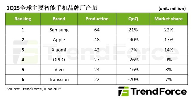 TrendForce集邦咨詢: 2025年第一季智能手機生產(chǎn)量達2.89億支