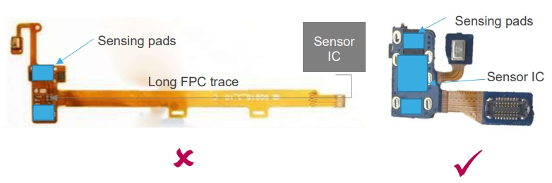圖4.1傳感線路走線較長(zhǎng)會(huì)使設(shè)計(jì)復(fù)雜化并限制性能,而走線較短則會(huì)簡(jiǎn)化設(shè)計(jì)并優(yōu)化性能
