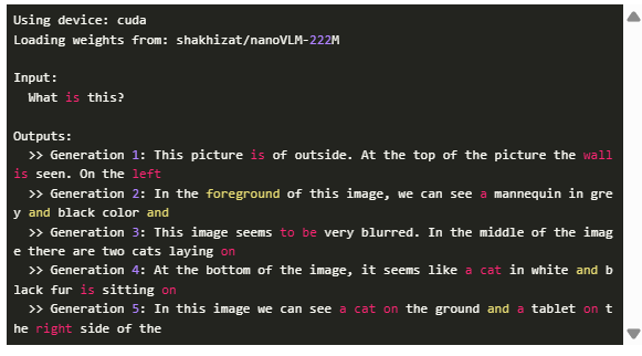 接下來(lái),使用上傳的模型進(jìn)行推理,執(zhí)行以下命令,如果不相同,將shakhizat/nanoVLM-222M替換為實(shí)際的模型ID: