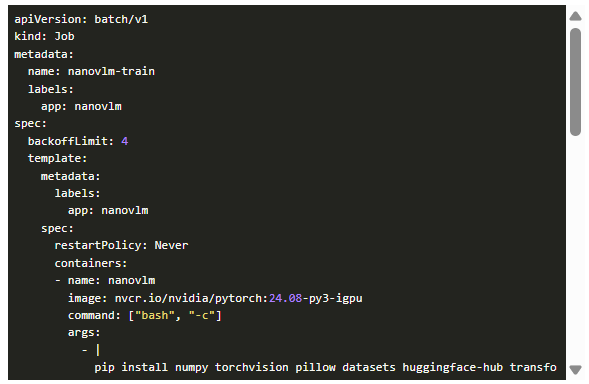 由于backoffLimit: 4, Kubernetes將重試pod最多4次。這對(duì)于控制批處理作業(yè)(如訓(xùn)練循環(huán))中的容錯(cuò)性非常有用,因?yàn)檫@些批處理作業(yè)可能由于暫時(shí)問(wèn)題而失敗。