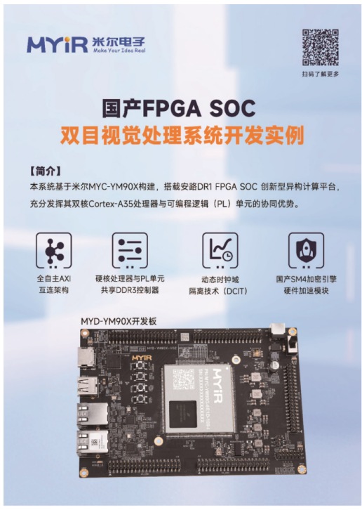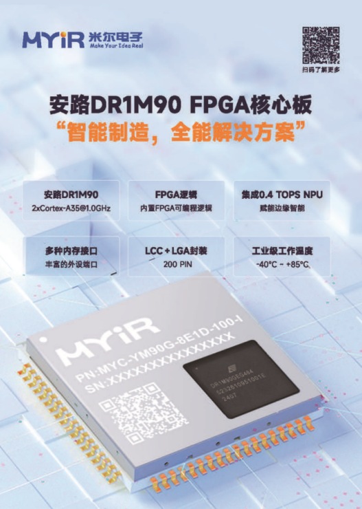 此次活動,米爾電子帶來國產(chǎn)FPGA產(chǎn)品:MYC-YM90X核心板及開發(fā)板。這款產(chǎn)品采用安路飛龍DR1M90處理器,高效賦能邊緣計算。DR1M90是安路科技推出的SALDRAGON系列高性能FPSoC器件之一。它集成了雙核ARM Cortex-A35處理器、FPGA可編程邏輯和AI引擎,延續(xù)了安路科技FPSoC家族的低功耗、軟硬件可編程和高擴展性的優(yōu)勢。
