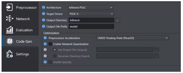 DeepCraft Studio被配置為生成優(yōu)化的C代碼(model.h/model. C),用于在英飛凌的PSoC 6微控制器上部署音頻分類模型。針對雙核Cortex-M4/M0+架構(gòu),該設(shè)置支持cmsis加速浮點運算,同時保持全精度(Float32)而無需量化。