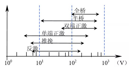 決定拓撲選擇的一個重要因素是輸入電壓和輸出/輸入比。圖1示出了常用隔離的拓撲相對適用的電壓范圍。拓撲選擇還與輸出功率,輸出電壓路數,輸出電壓調節(jié)范圍等有關。一般情況下,對于給定場合你可以應用多種拓撲,不可能說某種拓撲對某種應用是絕對地適用,因為產品設計還有設計者對某種拓撲的經驗、元器件是否容易得到、成本要求、對技術人員要求、調試設備和人員素質、生產工藝設備、批量、軍品還是民品等等因素有關。因此要選擇最好的拓撲,必須熟悉每種拓撲的長處和短處以及拓撲的應用領域。如果隨便選擇一個拓撲,可能一開始就宣布新電源設計的失敗。