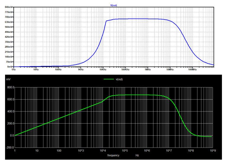 圖6:使用LTspice(上)和使用ngspice(下)的共發(fā)射極放大器的頻率響應(yīng)