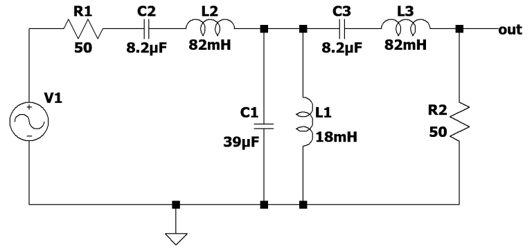 * Bandpass filter by Giovanni Di MariaV1 N001 0 SINE(0 1 1K) AC 12C2 N002 N003 8.2uFL2 N003 N004 82mHR1 N002 N001 50C1 0 N004 39uFL1 N004 0 18mHC3 N004 N005 8.2uFL3 N005 out 82mHR2 0 out 50.ac lin 10000 1 1k.backanno.endngspice的NETLIST略有不同,但主要原理是相同的。