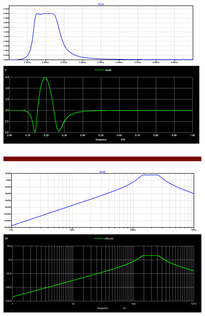 * REACTANCE by Giovanni Di MariaV1 N001 0 SINE(0 1 1K) AC 12C2 N002 N003 8.2uFL2 N003 N004 82mHR1 N002 N001 50C1 0 N004 39uFL1 N004 0 18mHC3 N004 N005 8.2uFL3 N005 out 82mHR2 0 out 50.control ac lin 10000 1 1k plot v(out).endc.end圖4顯示了帶有LTspice(淺色)和ngspice(深色)的帶通濾波器的頻率響應(yīng)。前兩張圖以線性表示法顯示橫坐標(biāo)和縱坐標(biāo)的測(cè)量值。通過(guò)替換腳本命令,可以在ngspice中獲取以分貝(Y)和對(duì)數(shù)刻度(X)為單位的圖表:plot v(out)通過(guò)以下內(nèi)容實(shí)現(xiàn):plot vdb(out) xlog然而,使用LTspice,只需右鍵單擊坐標(biāo)軸即可更改其屬性,對(duì)數(shù)圖形完全相同。