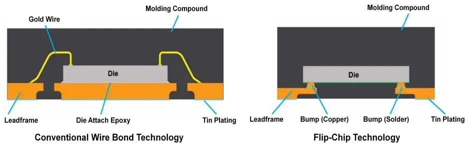 圖1 這是傳統(tǒng)接合線和倒裝芯片技術(shù)之間的比較。資料來源:Monolithic Power Systems