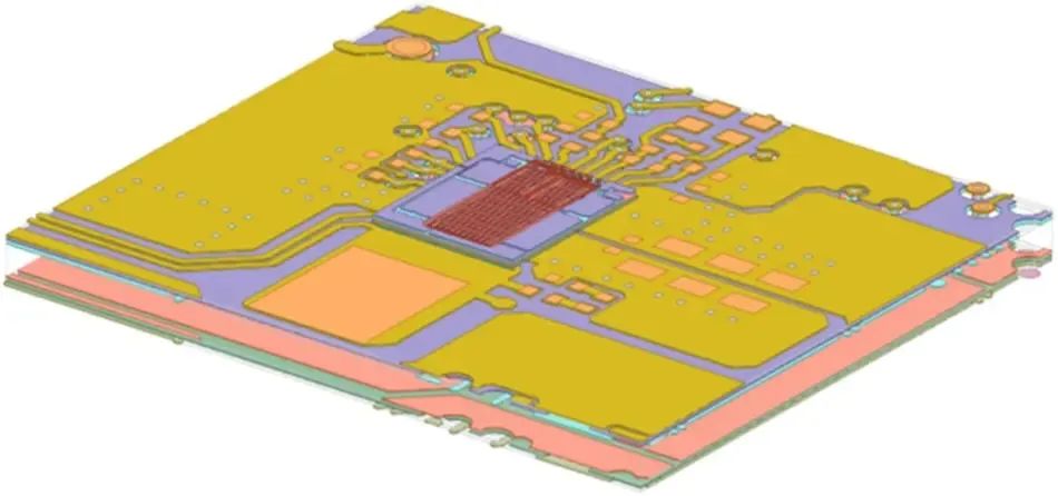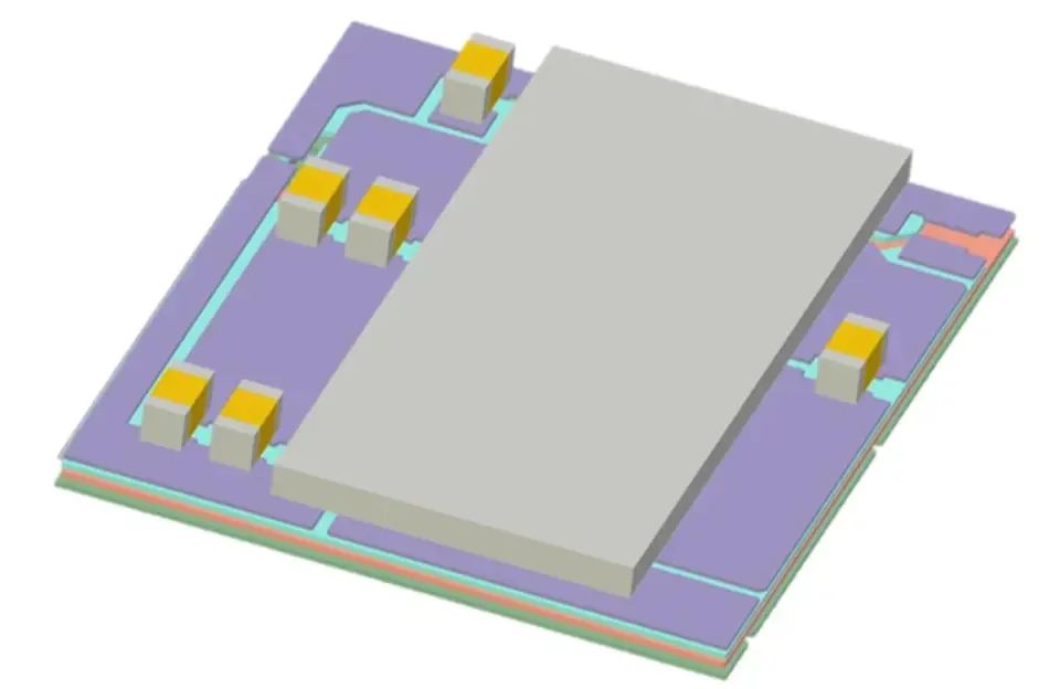 為了模擬寄生電感,我們構(gòu)建了DrMOS和PCB的3D結(jié)構(gòu)以進(jìn)行仿真分析(圖2)。材料、堆疊信息和PCB以及封裝層厚度等參數(shù)對(duì)于建模準(zhǔn)確性至關(guān)重要。