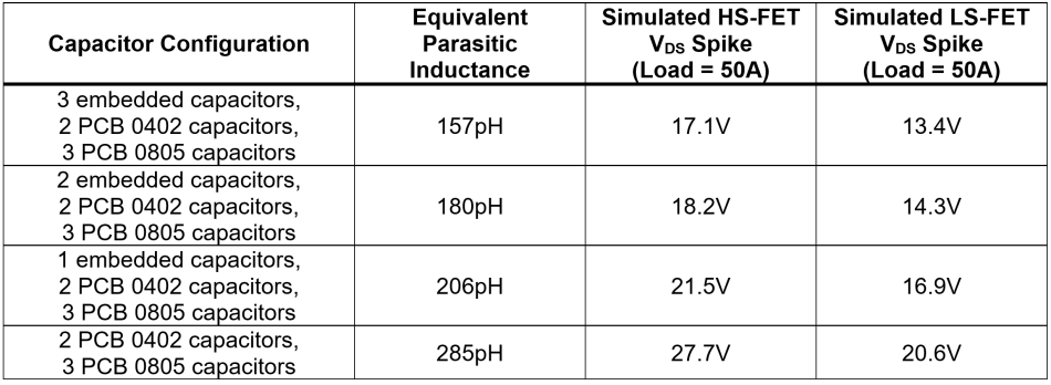 表2顯示了在DrMOS上使用不同去耦電容器配置時(shí)的等效寄生電感和VDS尖峰。