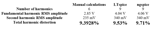 下表顯示了對于示例電路的信號諧波失真百分比的匯總。手動計算是使用仿真頻譜分析儀進(jìn)行的,但所使用的三種方法的失真百分比最終值非常相似。