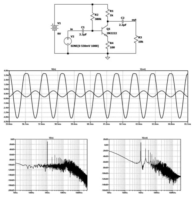 - 頂部是晶體管放大器的電路圖,其正弦信號源的零峰值振幅為530mV。電源電壓為9V。