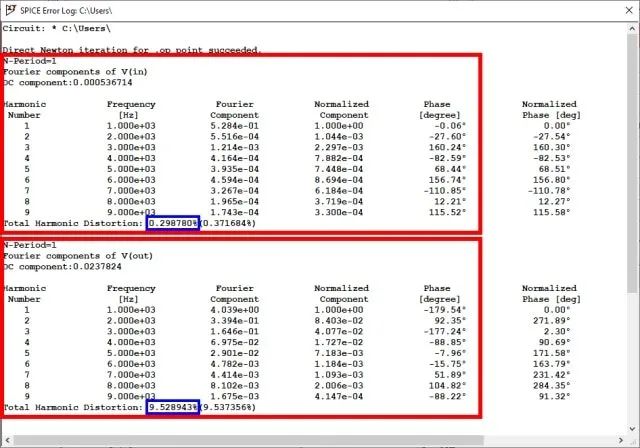 即使使用ngspice,諧波失真的計算也非常簡單。為此,在這種情況下,用戶必須在系統(tǒng)提示符下以批處理模式運(yùn)行軟件,命令如下: