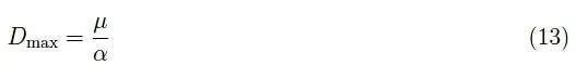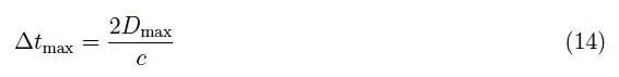 現(xiàn)在讓我們計算脈沖傳輸頻率,即一個脈沖與下一個脈沖之間的時間間隔T的倒數(shù)。為此,我們將來自位于Dmax(公式13)的目標的返回信號稱為最遠回波。該信號的往返時間由下式給出: