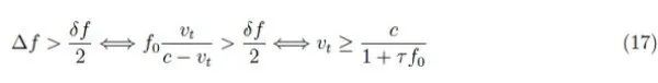 由此可見,接收器測量的不是f0,而是f0+Δf。然而,當且僅當Δf>δf/2時,多普勒頻移Δf是可檢測到的,否則f0+Δf落在發(fā)射頻帶內(nèi),因此B不一定在移動。圖5說明了先前的情況。