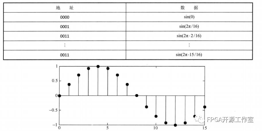 圖2 相位累加器位寬為4bit時(shí)LUT地址與存儲(chǔ)數(shù)據(jù)的對(duì)應(yīng)關(guān)系