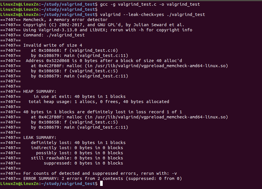 ==7407== Memcheck, a memory error detector ==7407== Copyright (C) 2002-2017, and GNU GPL'd, by Julian Seward et al. ==7407== Using Valgrind-3.13.0 and LibVEX; rerun with -h for copyright info ==7407== Command: ./valgrind_test ==7407== ==7407== Invalid write of size 4 ==7407== at 0x108668: f (valgrind_test.c:6) ==7407== by 0x108679: main (valgrind_test.c:11) ==7407== Address 0x522d068 is 0 bytes after a block of size 40 alloc'd ==7407== at 0x4C2FB0F: malloc (in /usr/lib/valgrind/vgpreload_memcheck-amd64-linux.so) ==7407== by 0x10865B: f (valgrind_test.c:5) ==7407== by 0x108679: main (valgrind_test.c:11) ==7407== ==7407== ==7407== HEAP SUMMARY: ==7407== in use at exit: 40 bytes in 1 blocks ==7407== total heap usage: 1 allocs, 0 frees, 40 bytes allocated ==7407== ==7407== 40 bytes in 1 blocks are definitely lost in loss record 1 of 1 ==7407== at 0x4C2FB0F: malloc (in /usr/lib/valgrind/vgpreload_memcheck-amd64-linux.so) ==7407== by 0x10865B: f (valgrind_test.c:5) ==7407== by 0x108679: main (valgrind_test.c:11) ==7407== ==7407== LEAK SUMMARY: ==7407== definitely lost: 40 bytes in 1 blocks ==7407== indirectly lost: 0 bytes in 0 blocks ==7407== possibly lost: 0 bytes in 0 blocks ==7407== still reachable: 0 bytes in 0 blocks ==7407== suppressed: 0 bytes in 0 blocks ==7407== ==7407== For counts of detected and suppressed errors, rerun with: -v ==7407== ERROR SUMMARY: 2 errors from 2 contexts (suppressed: 0 from 0)