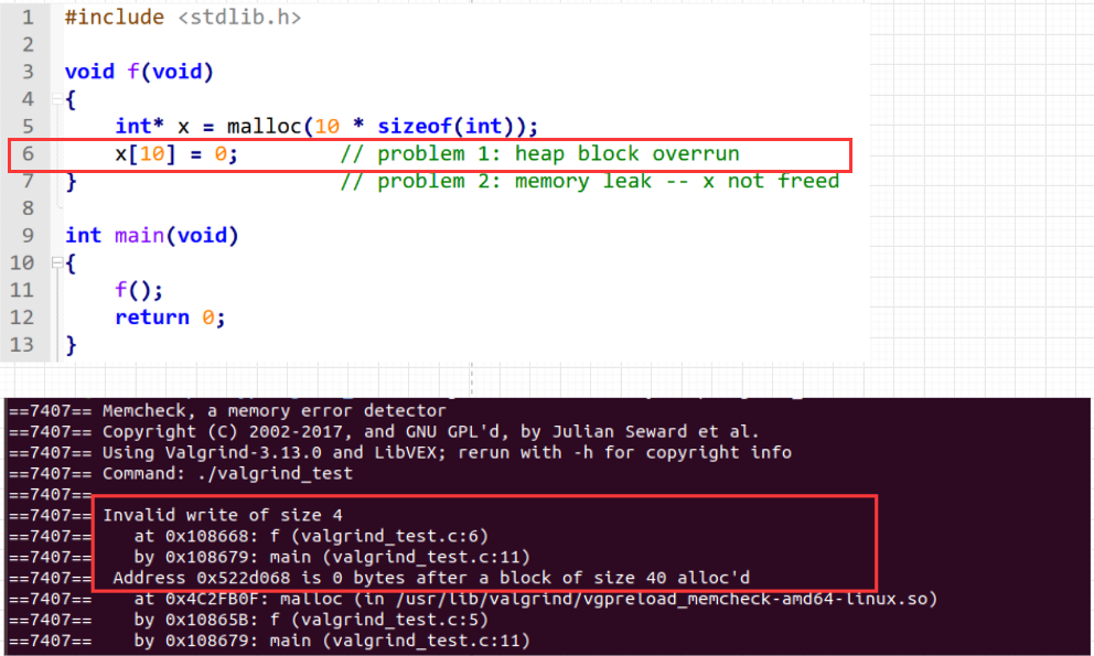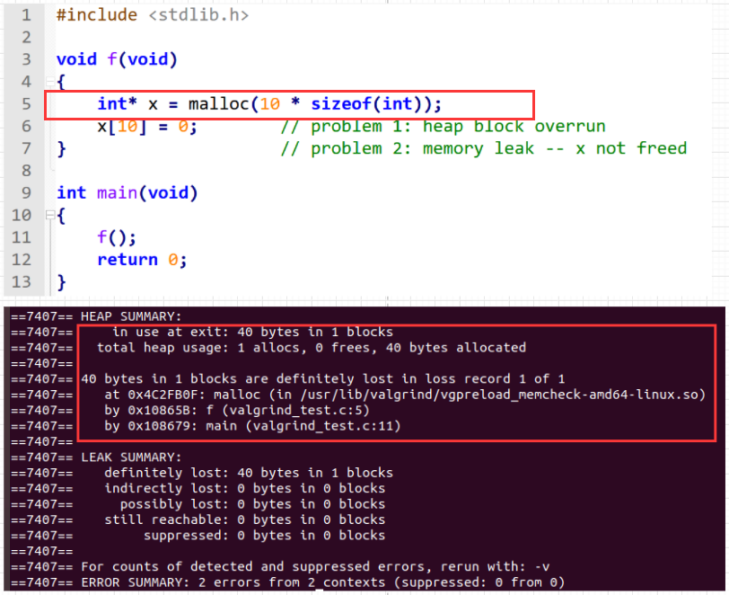 #includevoid f(void) { int* x = malloc(10 * sizeof(int)); x[10] = 0; // problem 1: heap block overrun } // problem 2: memory leak -- x not freed int main(void) { f(); return 0; }