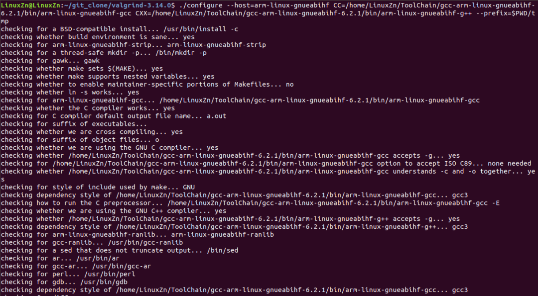 ./configure --host=arm-linux-gnueabihf CC=/home/LinuxZn/ToolChain/gcc-arm-linux-gnueabihf-6.2.1/bin/arm-linux-gnueabihf-gcc CXX=/home/LinuxZn/ToolChain/gcc-arm-linux-gnueabihf-6.2.1/bin/arm-linux-gnueabihf-g++ --prefix=$PWD/tmp
