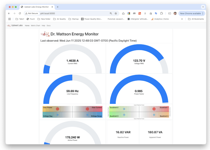 例如,我使用“甜甜圈”圖表在儀表板上顯示電流、電壓、線路頻率、功率因數(shù)等指標。我還使用了doughnutLabel注釋插件。這允許我將當前值表示為一個儀表,以獲得更令人愉悅的視覺外觀。單擊每個儀表板指標還會彈出一個指標圖表,顯示最近5分鐘的活動。讓它工作有點棘手!