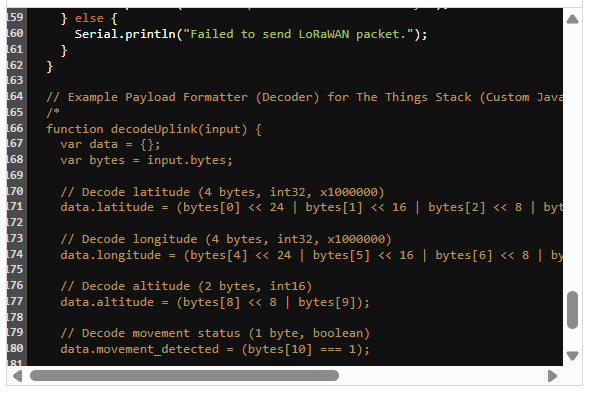 ?配置有效負載格式化器(解碼器):編寫Javascript代碼,將GPS坐標和運動狀態(tài)從二進制有效負載解碼為JSON對象。Things Stack與可以使用這些數(shù)據(jù)的地圖平臺直接集成。