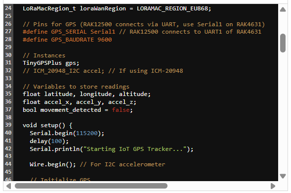 ?用于RAK模塊的Arduino庫(例如RAKwireless_RAK4631_BSP)和用于GPS的特定庫(例如TinyGPS++, SoftwareSerial,如果GPS使用非硬件UART引腳)和加速度計(例如SparkFun_ICM-20948_Arduino_Library或類似)。