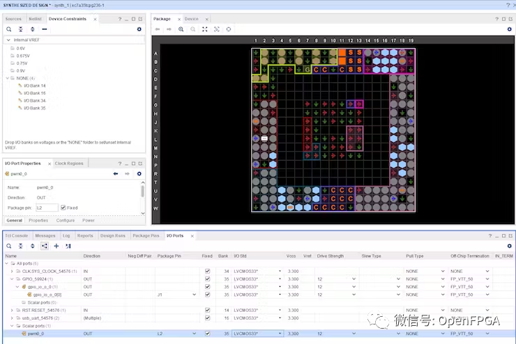 綜合完成后,我們可以打開綜合視圖并將 IO 分配給 GPIO 和定時(shí)器輸出 - 對(duì)于 GPIO,引腳是 J1,對(duì)于 PWM,引腳是 L2