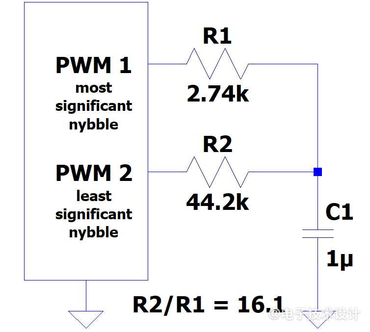 經(jīng)典脈寬調(diào)制器(PWM)所發(fā)出的重復(fù)序列,包括H個(gè)連續(xù)高邏輯電平(1),后跟L個(gè)連續(xù)低邏輯電平(0)。每個(gè)高電平和低電平都持續(xù)一個(gè)時(shí)鐘周期T=1/F(Hz)。所得到的占空比可定義為H/N,其中N=H+L個(gè)時(shí)鐘周期。N通常是2的冪,但N可以是任何大于0的整數(shù)。PWM必須面對(duì)的一個(gè)挑戰(zhàn)是通過濾波使數(shù)據(jù)流中的動(dòng)態(tài)AC部分實(shí)現(xiàn)衰減,同時(shí)保留其平均DC值。在整個(gè)輸出序列范圍內(nèi),經(jīng)典PWM的最低頻率分量F/N也是最大的,因此最難衰減。幸運(yùn)的是,這篇設(shè)計(jì)實(shí)例引入了一個(gè)簡(jiǎn)單的技巧,可以緩解這一挑戰(zhàn)。在討論這個(gè)技巧之前,有必要快速回顧一下其他交流能量緩解技術(shù),所有這些技術(shù)都像經(jīng)典技術(shù)一樣,采用某種計(jì)數(shù)器作為其驅(qū)動(dòng)引擎。我?guī)啄昵白x過的一種方法涉及N=2M-1個(gè)狀態(tài)的M位偽隨機(jī)序列生成器,其每個(gè)位都連接到數(shù)字比較器的一個(gè)輸入[1]。剩余的輸入以數(shù)字W表示。當(dāng)生成器的數(shù)量小于W時(shí),比較器輸出1;否則,輸出0。當(dāng)對(duì)發(fā)生器計(jì)時(shí)時(shí),結(jié)果是W個(gè)1、N-W個(gè)0以及W/N占空比的隨機(jī)數(shù)據(jù)流。所得到的“白噪聲”頻譜性質(zhì)比傳統(tǒng)PWM的F/N主要分量更容易濾除。一些SAM D Microchip微控制器(MCU)的硬件中內(nèi)置了更有效的緩解措施[2]。這些PWM修改了8位經(jīng)典PWM序列的2X個(gè)連續(xù)周期,以產(chǎn)生長(zhǎng)度為2X+8的更長(zhǎng)重復(fù)序列。這里X=4、5或6。對(duì)于K/2X+8的占空比,0≤K<2X+8,每個(gè)八位序列至少具有K/2X個(gè)1的整數(shù)部分。將剩余的K取2X的模個(gè)1盡可能均勻地分布在2X八位序列中。結(jié)果是經(jīng)占空比調(diào)制的八位序列的長(zhǎng)序列,其在生成的最低頻率F/2X+8 Hz處和附近具有非常少的頻譜能量,其中大部分在F/28處和附近,因此濾波問題得到很大簡(jiǎn)化。這些方法的硬件支持并不總是可用。幸運(yùn)的是,大多數(shù)MCU都可以輕松實(shí)現(xiàn)上述技巧,其描述如下。一旦N=2、3或4…多達(dá)28個(gè)(甚至216個(gè))狀態(tài)計(jì)數(shù)器驅(qū)動(dòng)PWM的初始設(shè)置完成,無需軟件干預(yù)的“設(shè)置(占空比)即不管”的PWM操作就近在咫尺。當(dāng)占空比確實(shí)需要改變時(shí),將所需的H值寫入輸出比較寄存器(OCR)即可。在大多數(shù)情況下,兩個(gè)具有獨(dú)立占空比的PWM可用,通常由同一計(jì)數(shù)器驅(qū)動(dòng)??紤]一下利用這些功能組合可以實(shí)現(xiàn)什么目標(biāo)。在一個(gè)示例中,可以將計(jì)數(shù)器配置為N=16。PWM的占空比可為1/16、2/16、3/16,一直到15/16。剩余狀態(tài)將為0/16或16/16。兩個(gè)PWM輸出由兩個(gè)電阻按1:16的比例串聯(lián)組合連接。在這兩個(gè)電阻的連接處,有24×24=28種可能的平均值,就像單個(gè)PWM呈現(xiàn)28種不同狀態(tài)一樣。影響交流衰減的最簡(jiǎn)單的方法是在該結(jié)點(diǎn)和地之間連接一個(gè)電容器(圖1是完整電路的示例。)