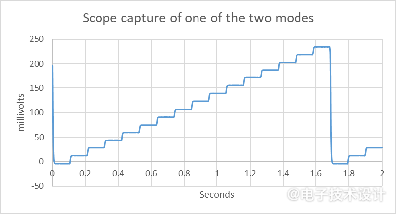 圖2給出了兩種模式之一的示波器捕獲波形;兩種模式的屏幕截圖無法區(qū)分,分辨率約為18mV。必須在R1-R2-C1結(jié)點(diǎn)和負(fù)直流電壓之間連接一個(gè)額外的電阻(未顯示)。在不影響R1-R2比率的情況下,這會(huì)將波形的電壓移至接近地的電壓,以便示波器可以以高分辨率顯示它。