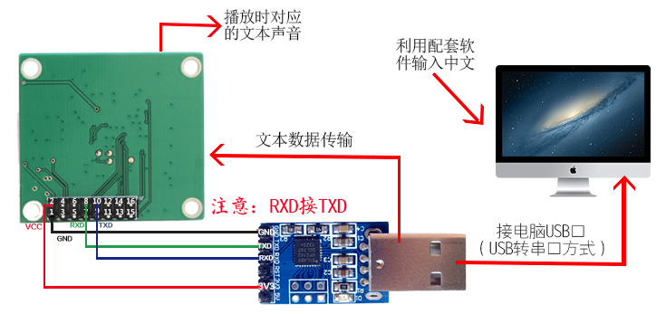 PC上使用官方演示程序《科大訊飛語音合成芯片PC端演示程序》,使用串口通信進(jìn)行測試的接線方式如下: