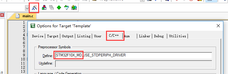 修改全局宏定義,將STM32F10X_HD修改為STM32F10X_MD。