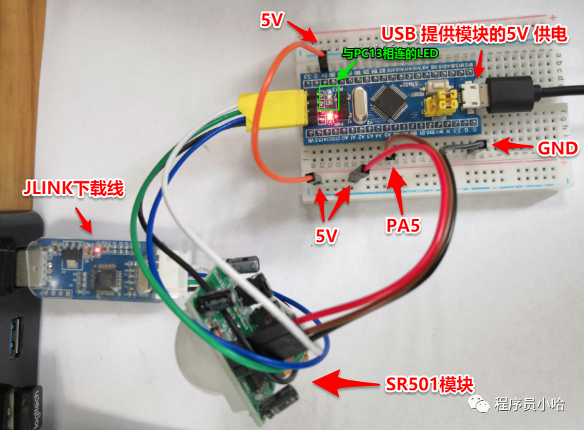 //SR501_OUT初始化--PA5,設置成輸入void SR501_Init(void){ GPIO_InitTypeDef GPIO_InitStructure; RCC_APB2PeriphClockCmd(RCC_APB2Periph_GPIOA,ENABLE); //SR501_OUT GPIO_InitStructure.GPIO_Pin = GPIO_Pin_5; GPIO_InitStructure.GPIO_Mode = GPIO_Mode_IPU; GPIO_Init(GPIOA, &GPIO_InitStructure);} // 板載LED初始化--PC13void LED_Init(void){ GPIO_InitTypeDef GPIO_InitStructure; RCC_APB2PeriphClockCmd(RCC_APB2Periph_GPIOC,ENABLE); //使能PORTA時鐘 //SR501_OUT GPIO_InitStructure.GPIO_Pin = GPIO_Pin_13; GPIO_InitStructure.GPIO_Mode = GPIO_Mode_Out_PP; GPIO_InitStructure.GPIO_Speed = GPIO_Speed_50MHz; GPIO_Init(GPIOC, &GPIO_InitStructure); LED = 1;} int main(void){ //初始化 delay_init(); SR501_Init(); LED_Init(); while(1) { if(SR501_OUT) { LED = 0; } else { LED = 1; } delay_ms(10); }}