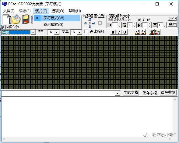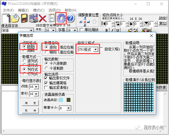 推薦使用比較好用的取模軟件:PCtoLCD2002。