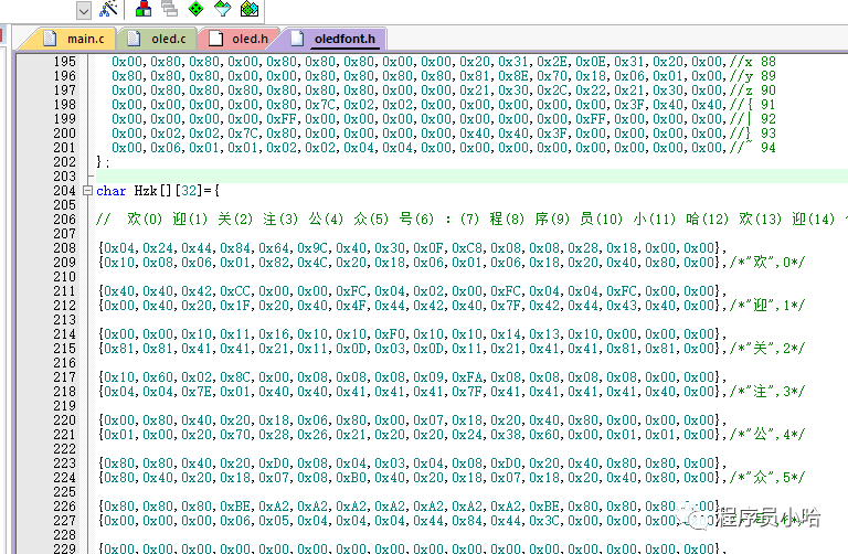 將生成的字庫信息復制到工程中待用,一般都是把自定義的字庫放到一個單獨的.h文件中。