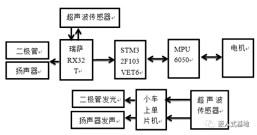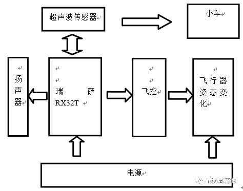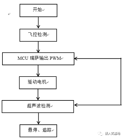 由于題目中要求起飛懸停降落都要控制在一個直徑為75CM的圓圈內,且本次材料清單中沒有關于紅外避障或尋跡傳感器的選用,因此只能在客觀條件允許的條件下盡量保證飛機能穩(wěn)定起飛穩(wěn)定降落,因而我們決定在超聲波傳感器測定與地面距離小于1.2m時瑞薩芯片會將信號傳遞給STM32飛控來使得調速四個電機加速啟動讓飛機得以起飛,且起飛過程中截取飛控傳感器模塊中的MPU6050會將姿態(tài)角傳給STM32飛控中,飛控會自動調整PWM輸出的占空比達到調速使得起飛過程盡可能平穩(wěn),在超聲波傳感器測得飛行高度達到1.2m至1.6m之間時瑞薩發(fā)出PWM波使得飛控開始讓電機減速,在加速度傳感器輸出趨近于0時飛機基本實現平穩(wěn)懸停。