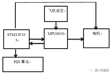 STM32最小系統(tǒng)板從飛控傳感器模塊中的MPU-6050芯片獲取的數據是飛行器的三軸角速度和三軸角加速度,MCU對數據進行PID算法處理可以得到飛行器當前的飛行姿態(tài)。PID是比例、積分、微分的縮寫。比例調節(jié)是按比例反應系統(tǒng)的偏差,系統(tǒng)一旦出現了偏差,比例調節(jié)立即產生調節(jié)作用用以減少偏差。比例作用大,可以加快調節(jié),減少誤差,但是過大的比例,使系統(tǒng)的穩(wěn)定性下降,甚至造成系統(tǒng)的不穩(wěn)定。積分調節(jié)是使系統(tǒng)消除穩(wěn)態(tài)誤差,提高無差度。因為有誤差,積分調節(jié)就進行,直至無差,積分調節(jié)停止,積分調節(jié)輸出一常值。積分作用的強弱取決與積分時間常數Ti,Ti越小,積分作用就越強。反之Ti大則積分作用弱,加入積分調節(jié)可使系統(tǒng)穩(wěn)定性下降,動態(tài)響應變慢。積分作用常與另兩種調節(jié)規(guī)律結合,組成PI調節(jié)器或PID調節(jié)器。幾者結合從而保持飛行姿態(tài)穩(wěn)定。