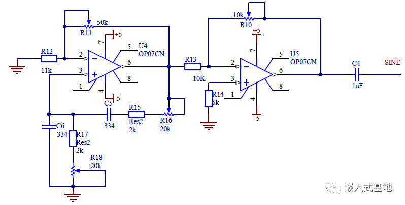 RC串并聯(lián)電路構(gòu)成正負(fù)反饋支路,同時兼做選頻網(wǎng)絡(luò),R15、R17、R11構(gòu)成負(fù)反饋和穩(wěn)幅環(huán)節(jié)。